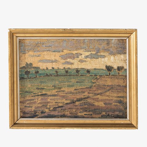 Olie på lærred. Landskab med marker i guldbemalet ramme. Signeret.
