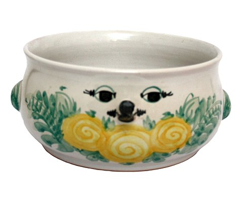 Bjørn Wiinblad, Stor urtepotte med fuglemotiv i gule og grønne farver. Nr. V68 1979. Højde 9,5 cm. Diameter 19,5 cm. Minimale chip glasurafslag under næb og den ene vinge og på kanten, ellers pæn stand. Pris: 1500 kr.