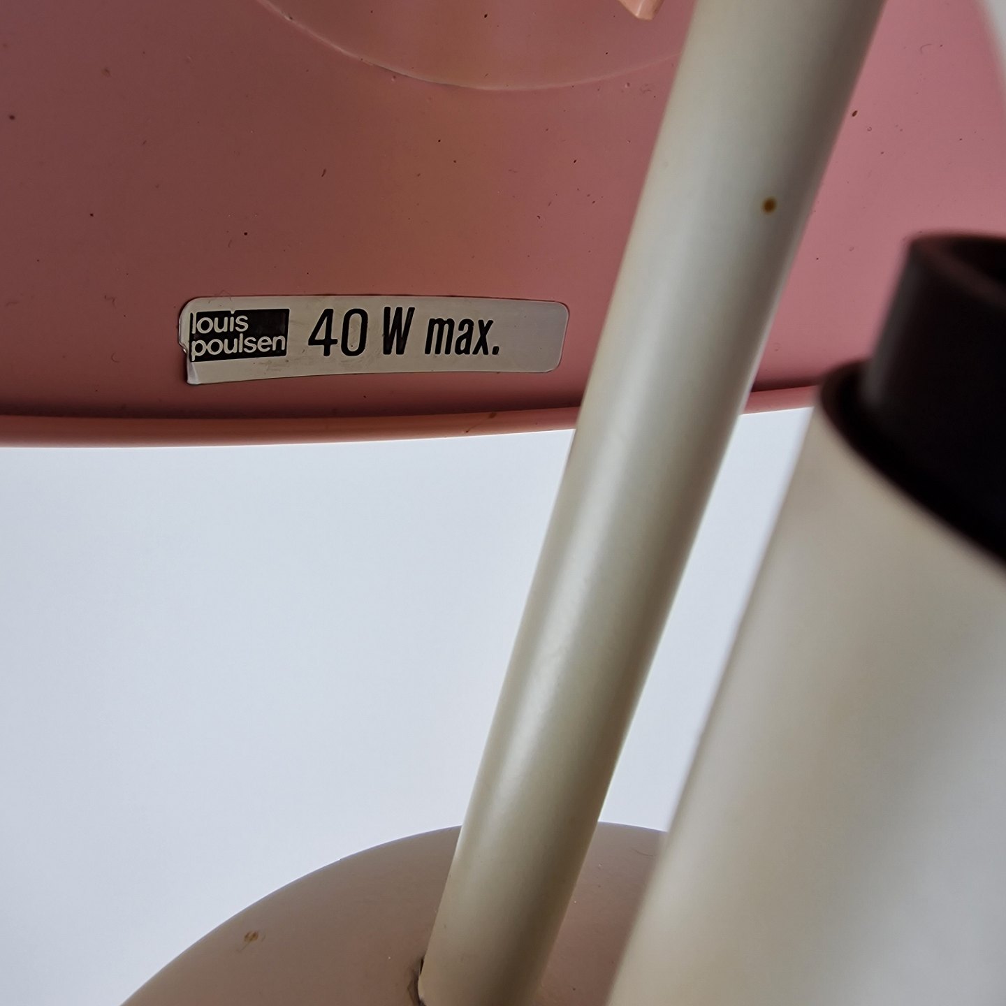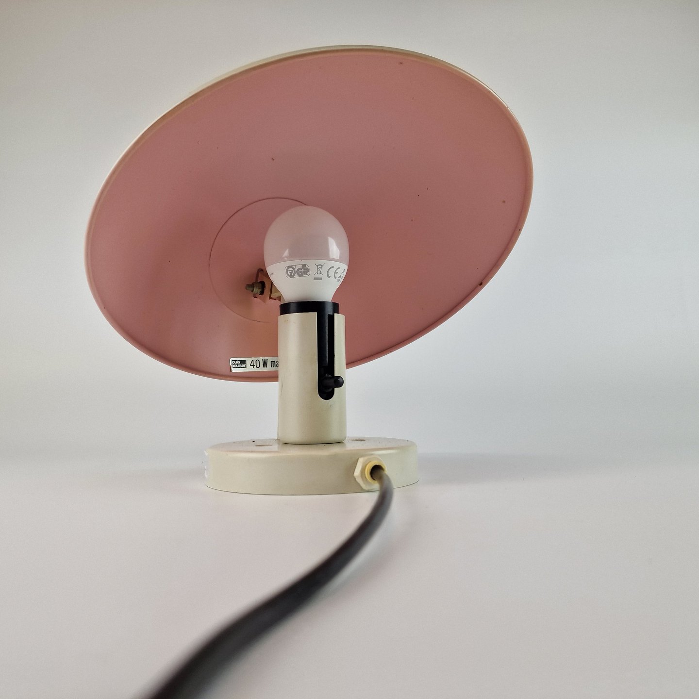 Væglampe formet som en hat. Hvidt metal med rosa inderside. Designet i 70'erne