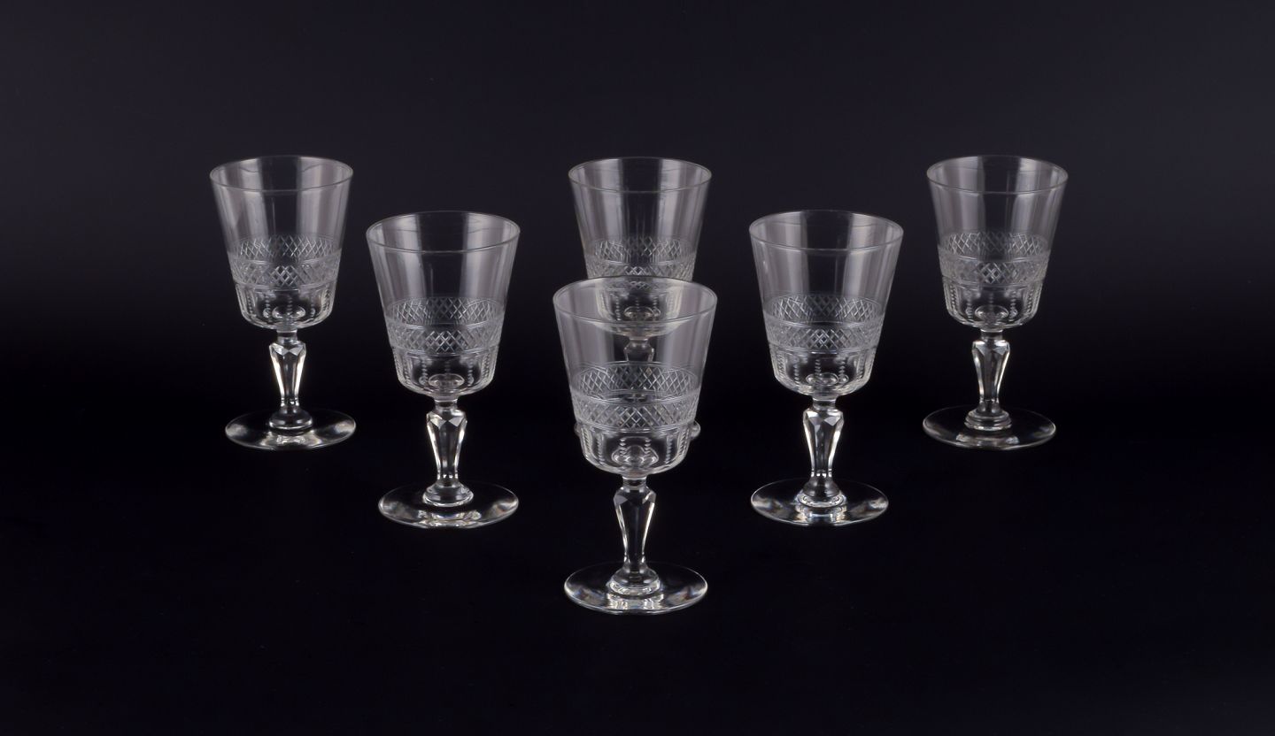 Et sæt på seks mundblæste franske rødvinsglas i krystalglas. Facetslebet. Håndlavet.