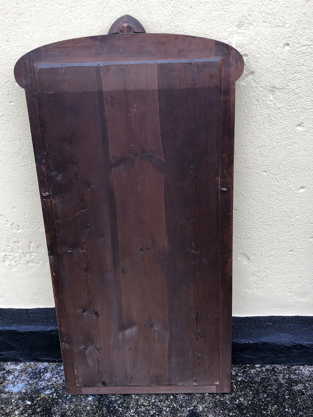 Large mirror in a fine wooden frame. Height: 125 cm, width 63 cm. Has previously been mounted for tilting, so hole in the side of the frame (see photo), otherwise nice used condition.