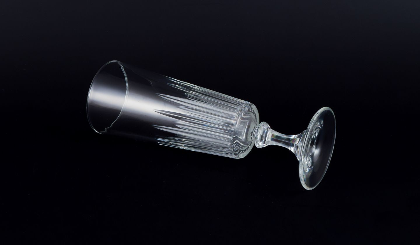 Et sæt på seks svenske champagnefløjter i klart glas. Facetslebet.