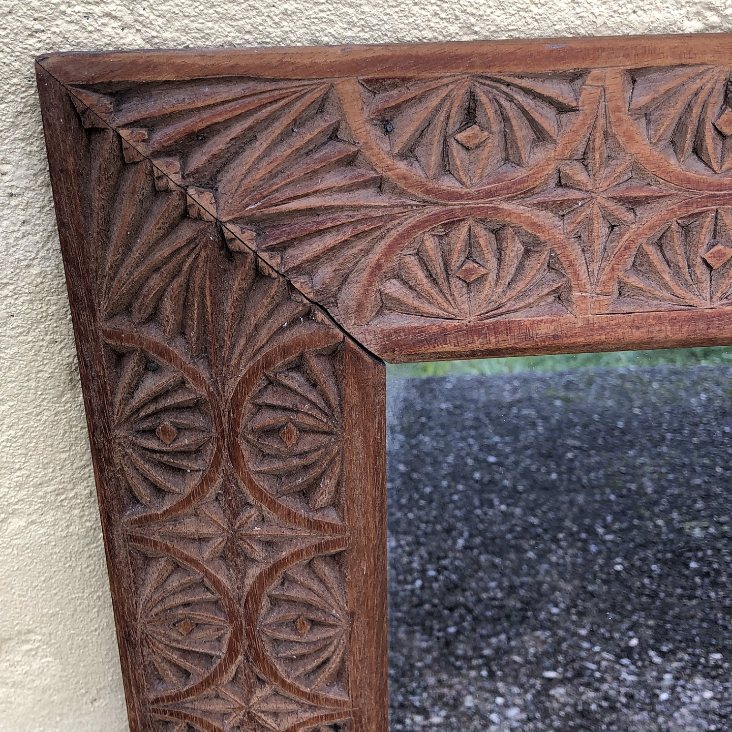 Spejl i træramme, Rammen med mange udskæringer. Mål: 61x75 cm