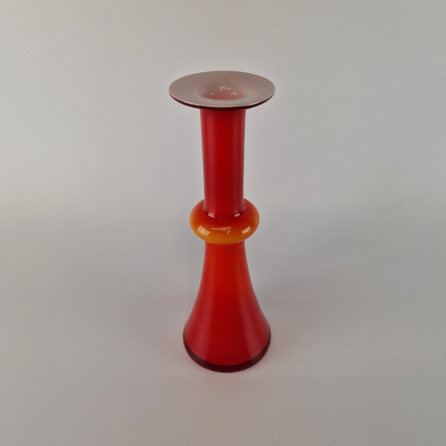 Vase i opalhvidt mundblæst glas med rødt overfang. Vasen kan også bruges som lysestage.