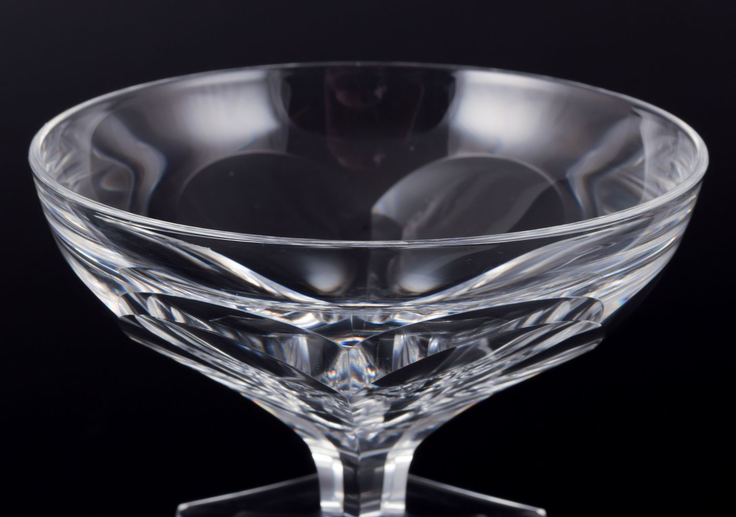Baccarat, Frankrig, et sæt på fem Art Deco champagneskåle i klart krystalglas. Facetslebet.