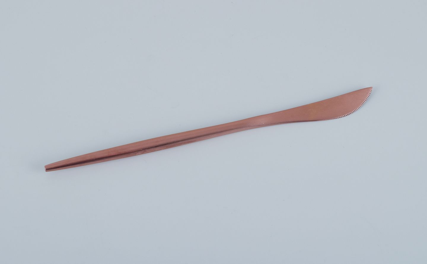 Et firepersoners modernistisk middagsbestik i messing bestående af fire middagsknive og fire middagsgafler.