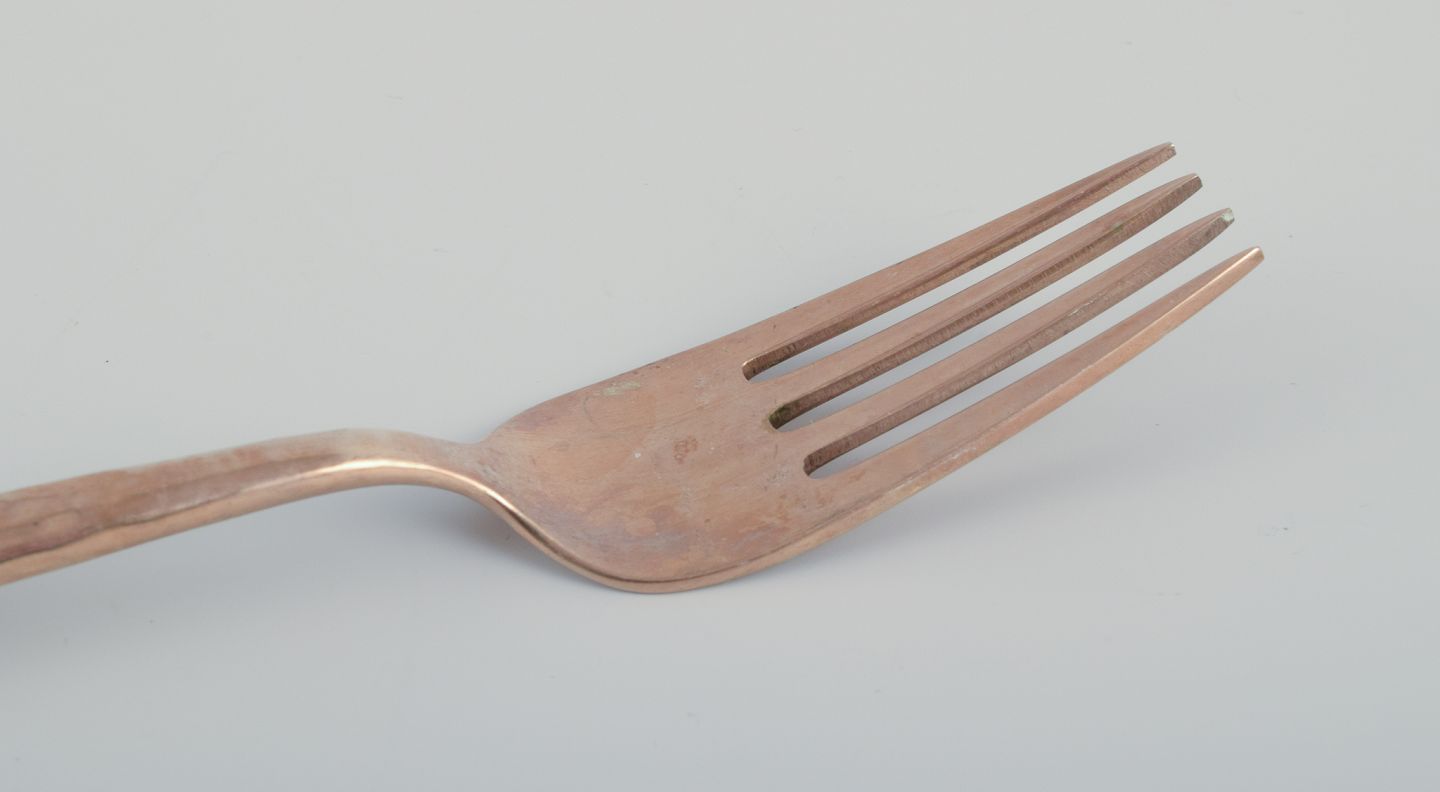 Skandinavisk designer. Tolvpersoners middagsservice bestående af tolv middagsknive og tolv middagsgafler i hammerslået messing. Håndlavet i høj kvalitet.
