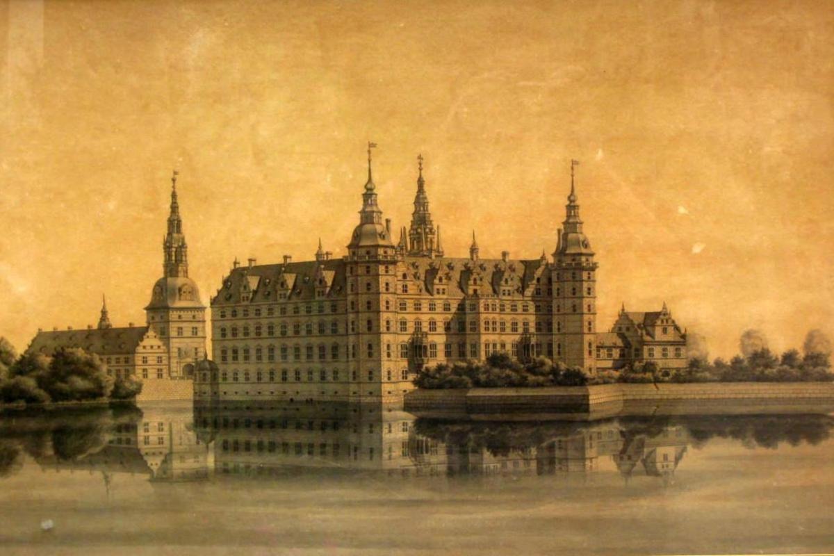 Danielsen, Johan Christian Sverin (1840 - 1914): Frederiksborg Slot. Laveret tusch. Betegnet på bagsiden. 41 x 62 cm. Med samtidig guldramme.