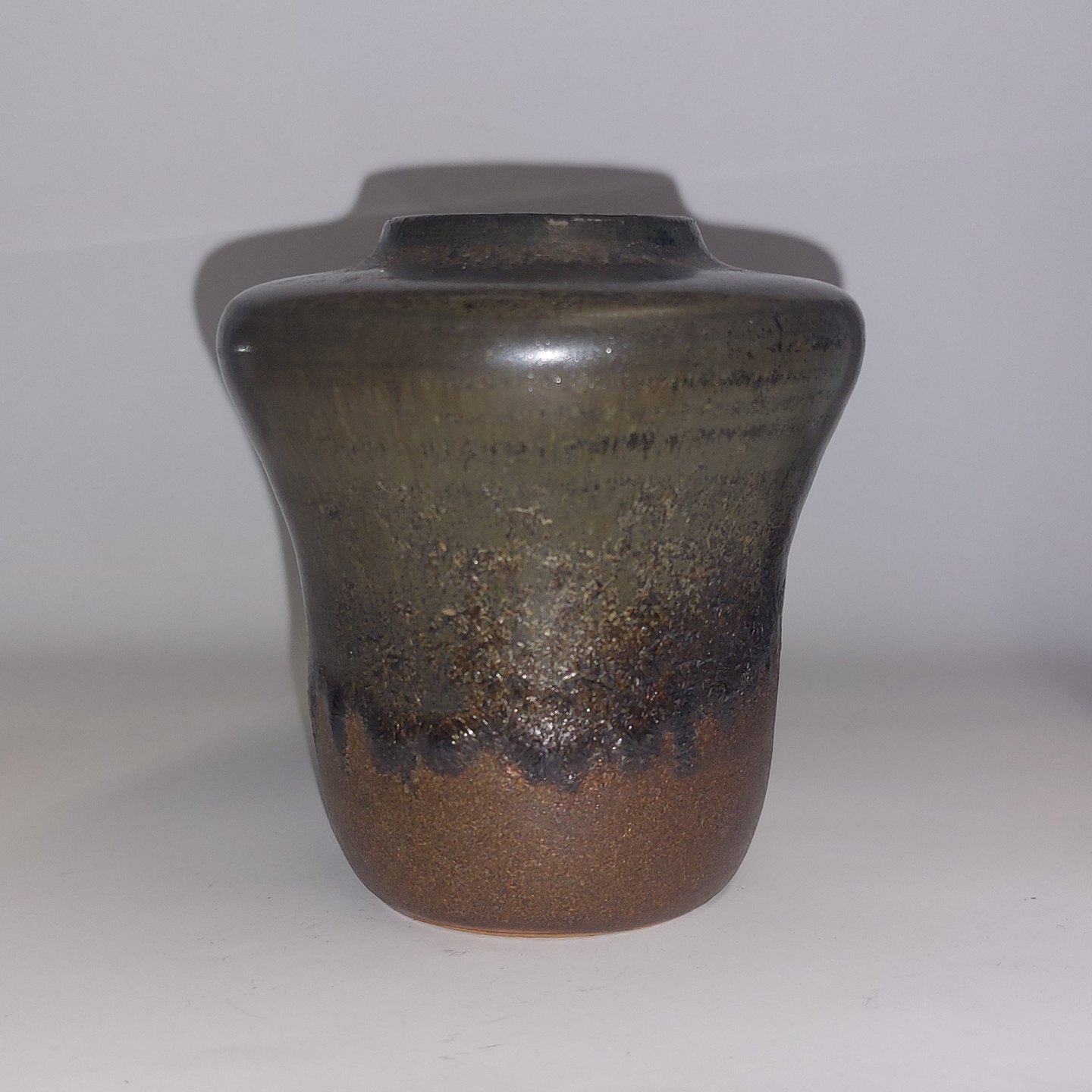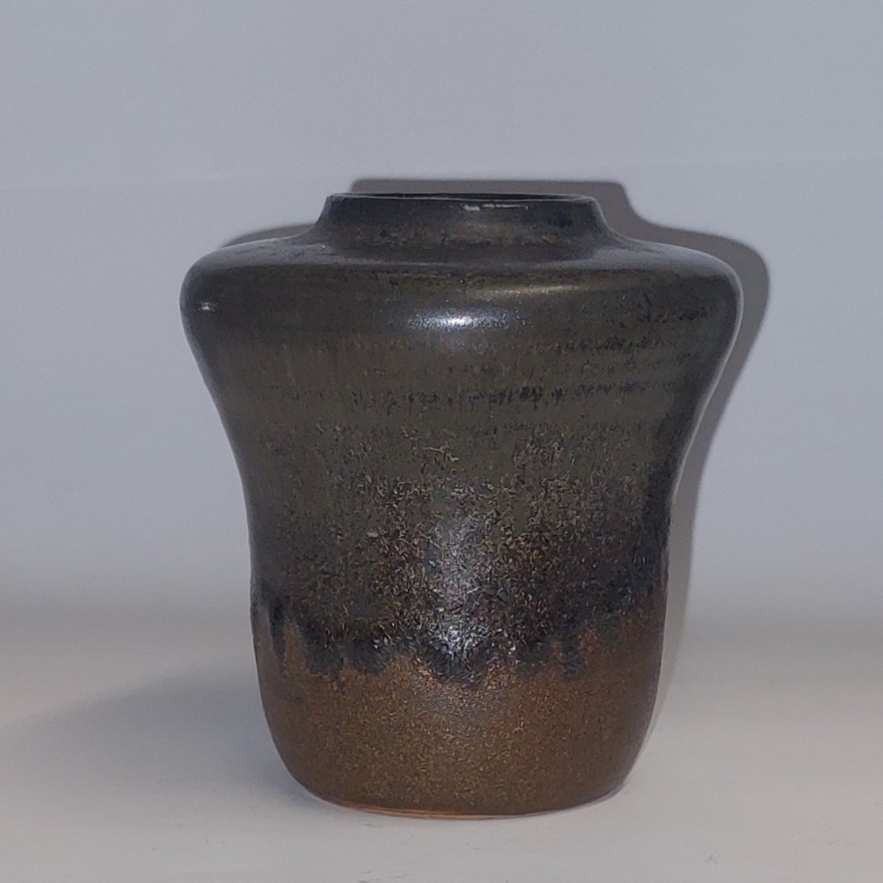 Vase I keramik fra Royal Copenhagen designet af svenske Patrick Nordström (1870-1929) , der arbejdede for fabrikken fra 1912-1922. Sideløbende havde han produktion af stentøj på eget værksted ved Islev, Husum. Til sin død. Vasen er dækket af en nuanceret metallisk brunlig glasur. Fabriksmærket og signeret af kunstneren på bunden.H. 9,5 cm