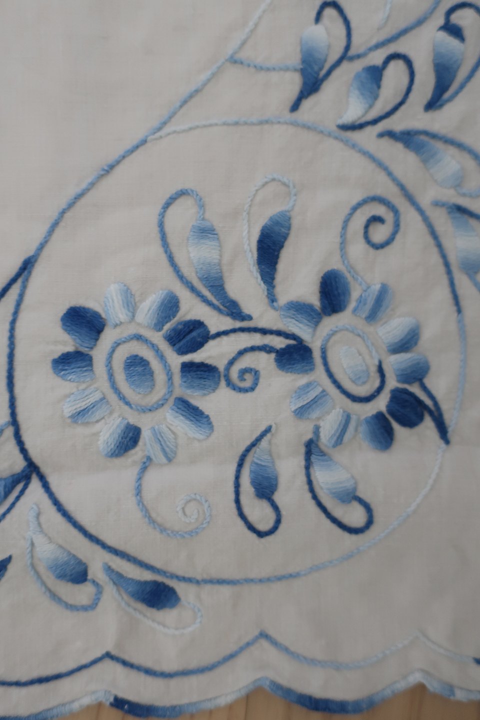 Smukt gammelt broderet stykke med blåt håndbroderi