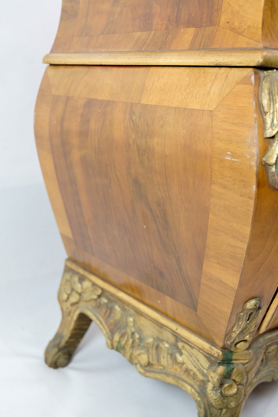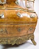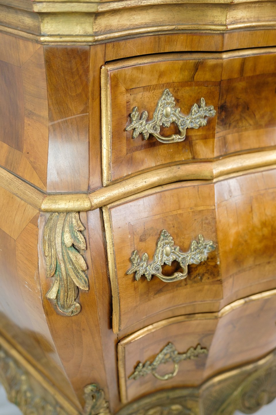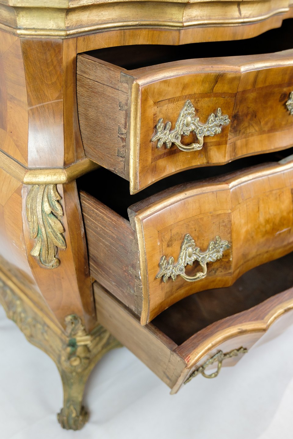 Den bombé-formede kontur af kommoden tilføjer en kurvet og indbydende dimension til rummet. Nøddetræet, med dets rige patina og naturlige variationer, udstråler varme og skaber en forbindelse til fortiden. De detaljerede udskæringer og forgyldte accenter fremhæver rokoko-stilens overdådighed og kompleksitet.