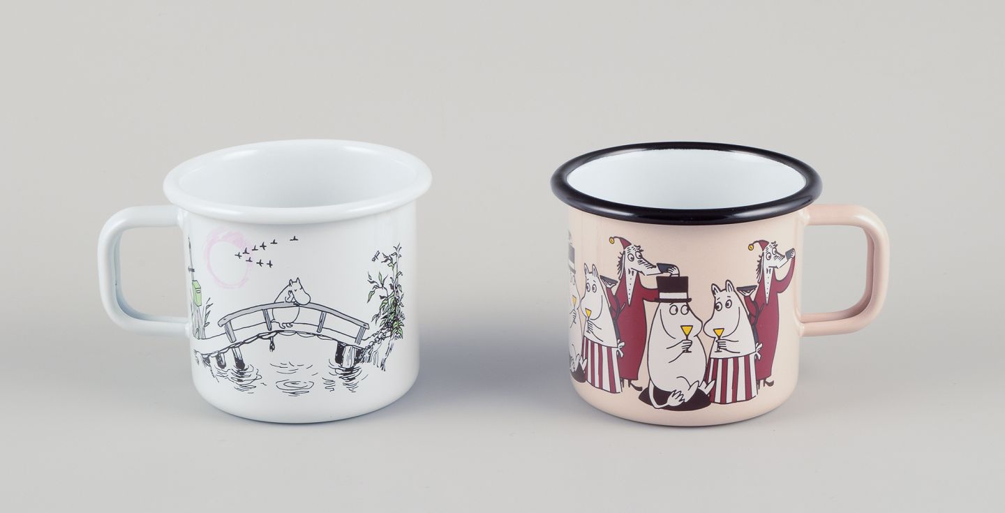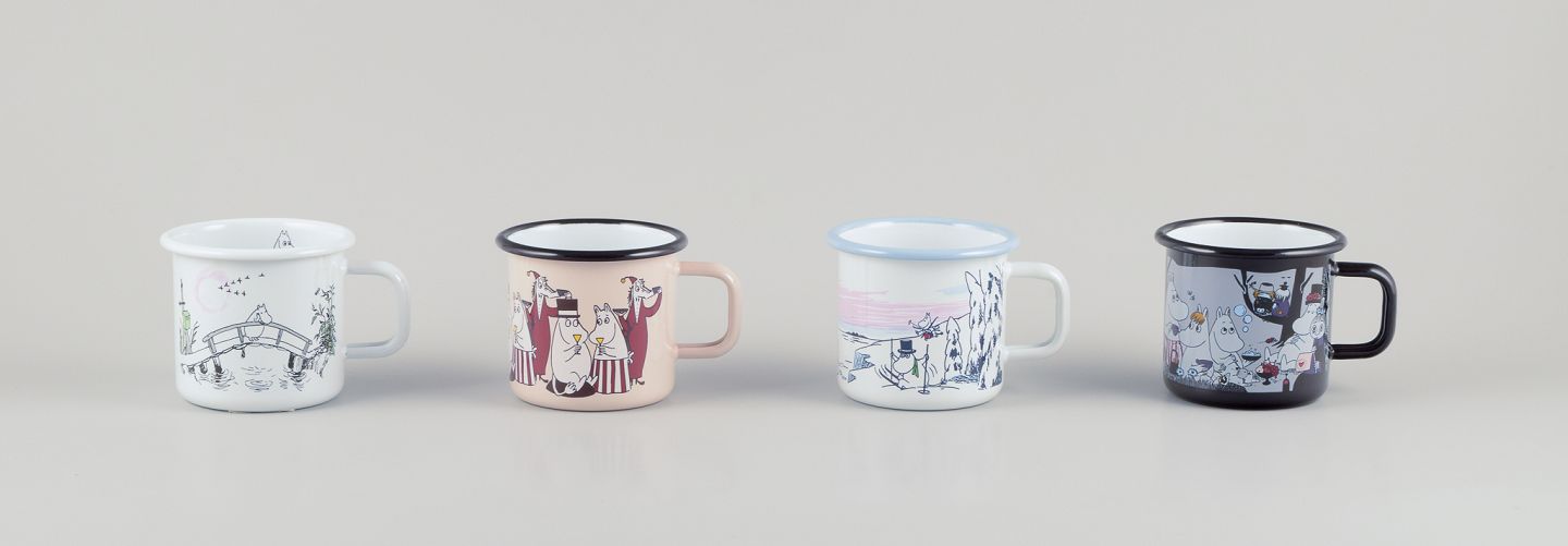 Fire emaljekrus med forskellige motiver fra Mumitrolde-universet