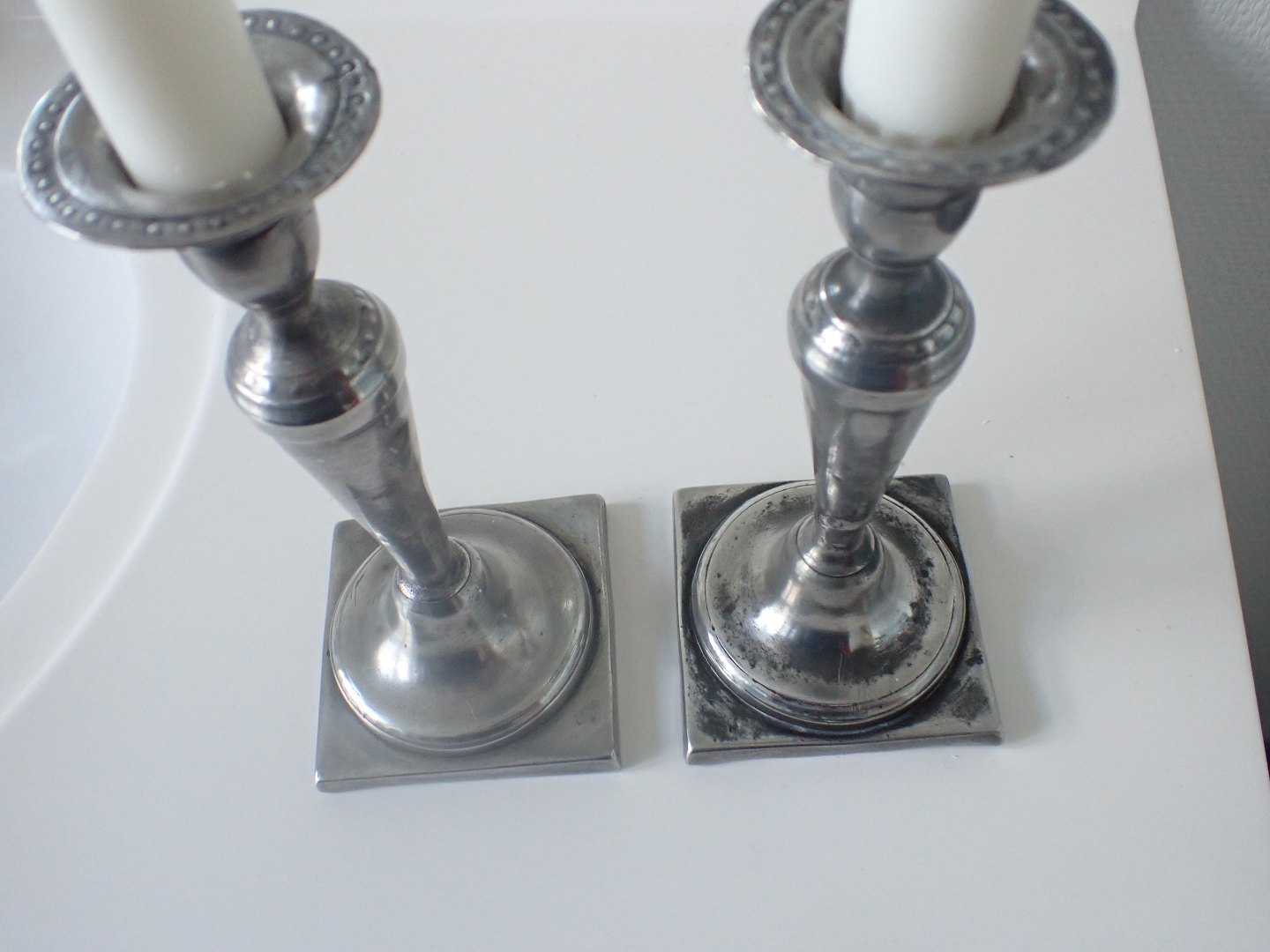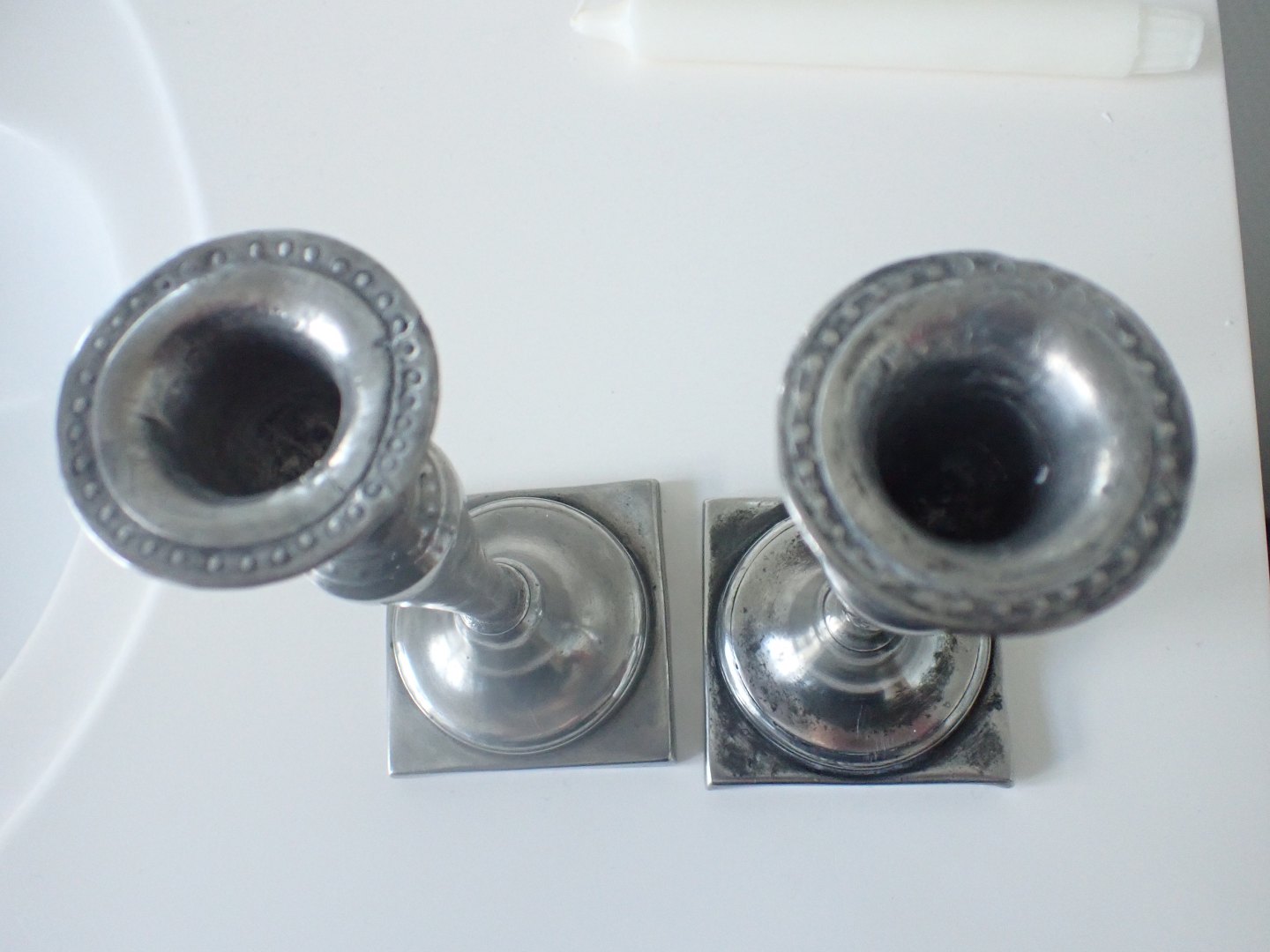 Et par tinstager fra tillig 1800 tal. Med firkantet fod og et par perlekanter. Højde: 18,2 cm. Fod: 8,1 cm. I pæn stand med en del tidstypisk slid.