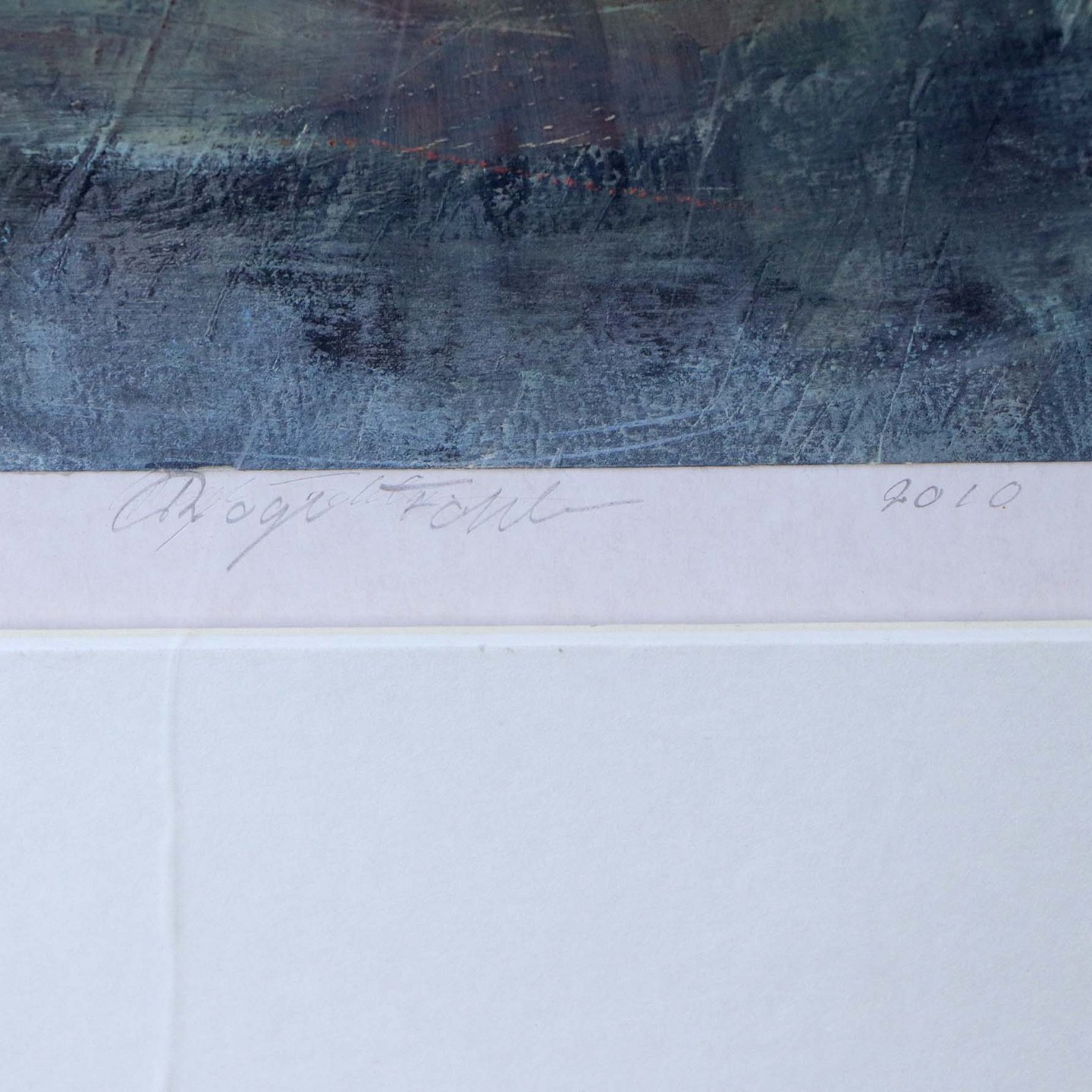 Indrammet pasteltegning med passepartout i sølvmalet ramme. Naturtegning fra år 2010 i blå pastel med motiv af to galopperende heste