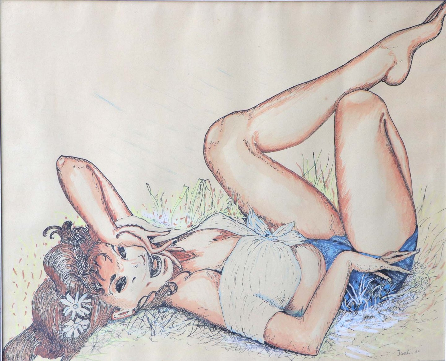 Indrammet tegning i hvid ramme. Farvelagt blæktegning fra 1964 med portræt af ung kvinde liggende i græsområde.