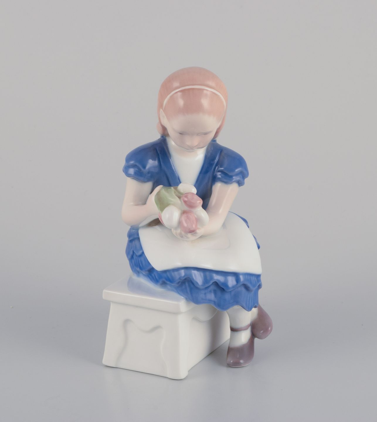 Porcelænsfigur af siddende pige med blomsterbuket i armene.