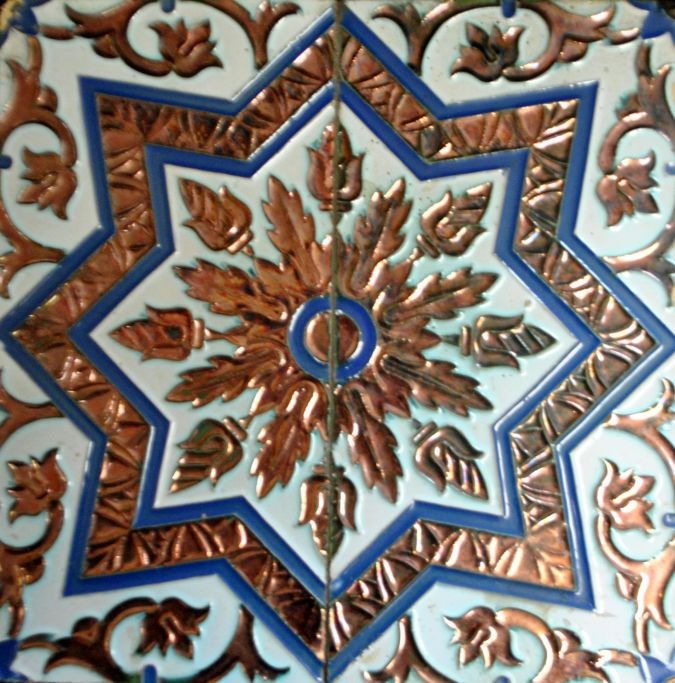 2 firpas med geometriske fliser, 19. årh. Polykrom dekoreret med bl.a. lustra. 28 x 28 cm.