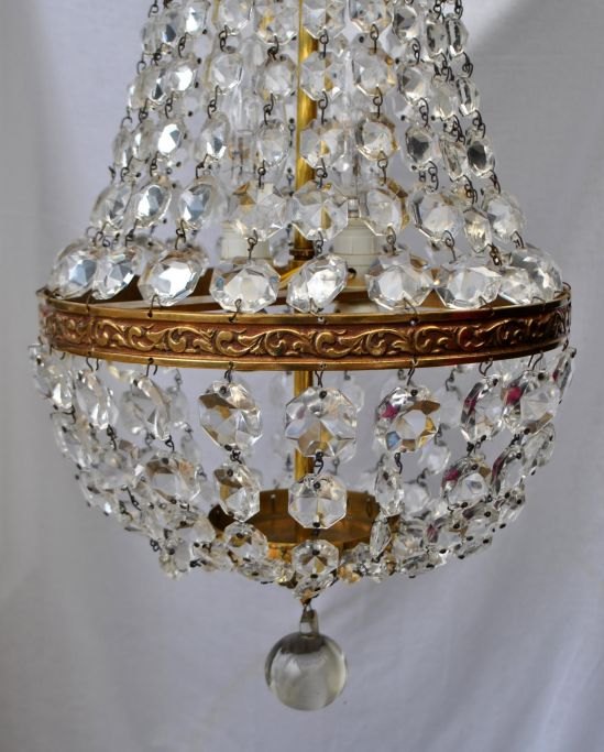 Prisme loftskrone, 20. årh. Messingstel med blomsterranker. Med 4 elfatninger. Med 375 prismer i alt. H: 72 cm. Dia.: 26 cm.