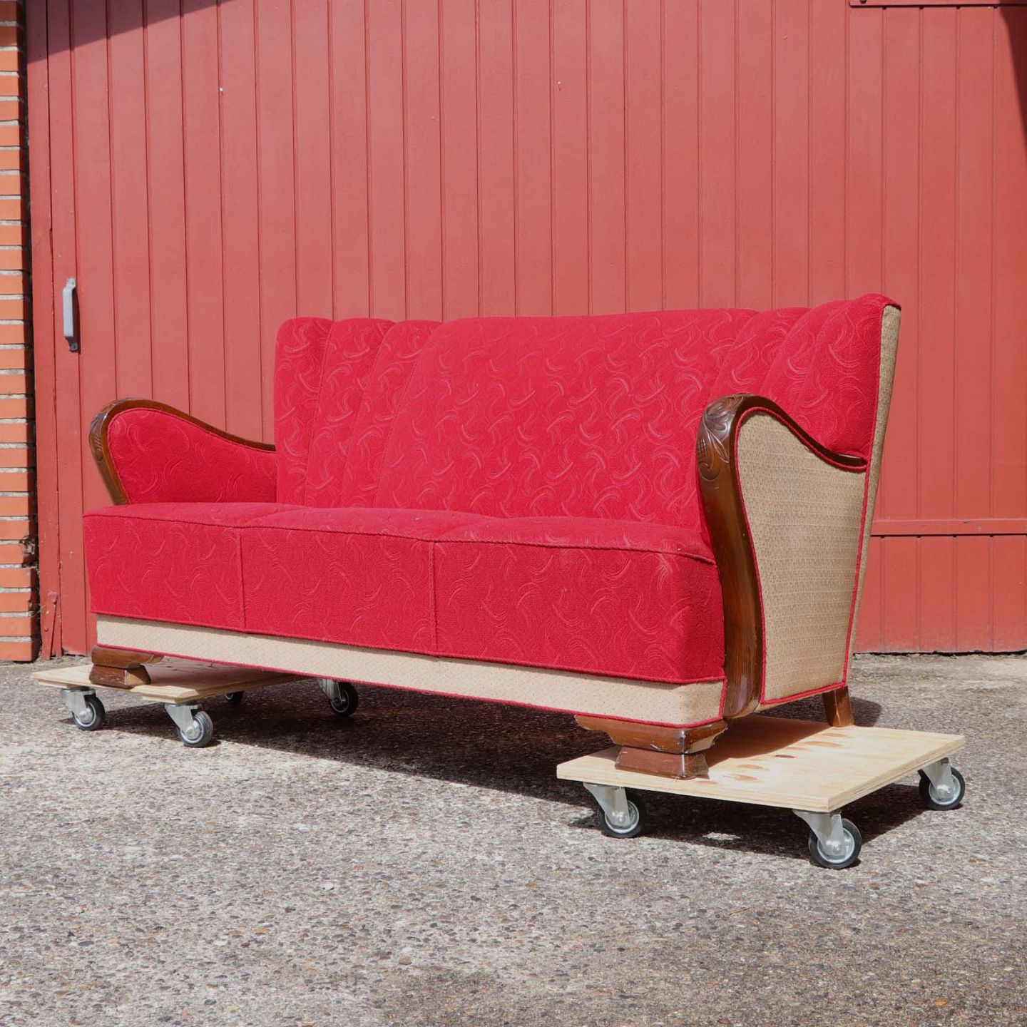 Overpolstret tre personers sofa med lakeret armlæn og ben i mørkt træ og polstret med rødt struktureret stof.
