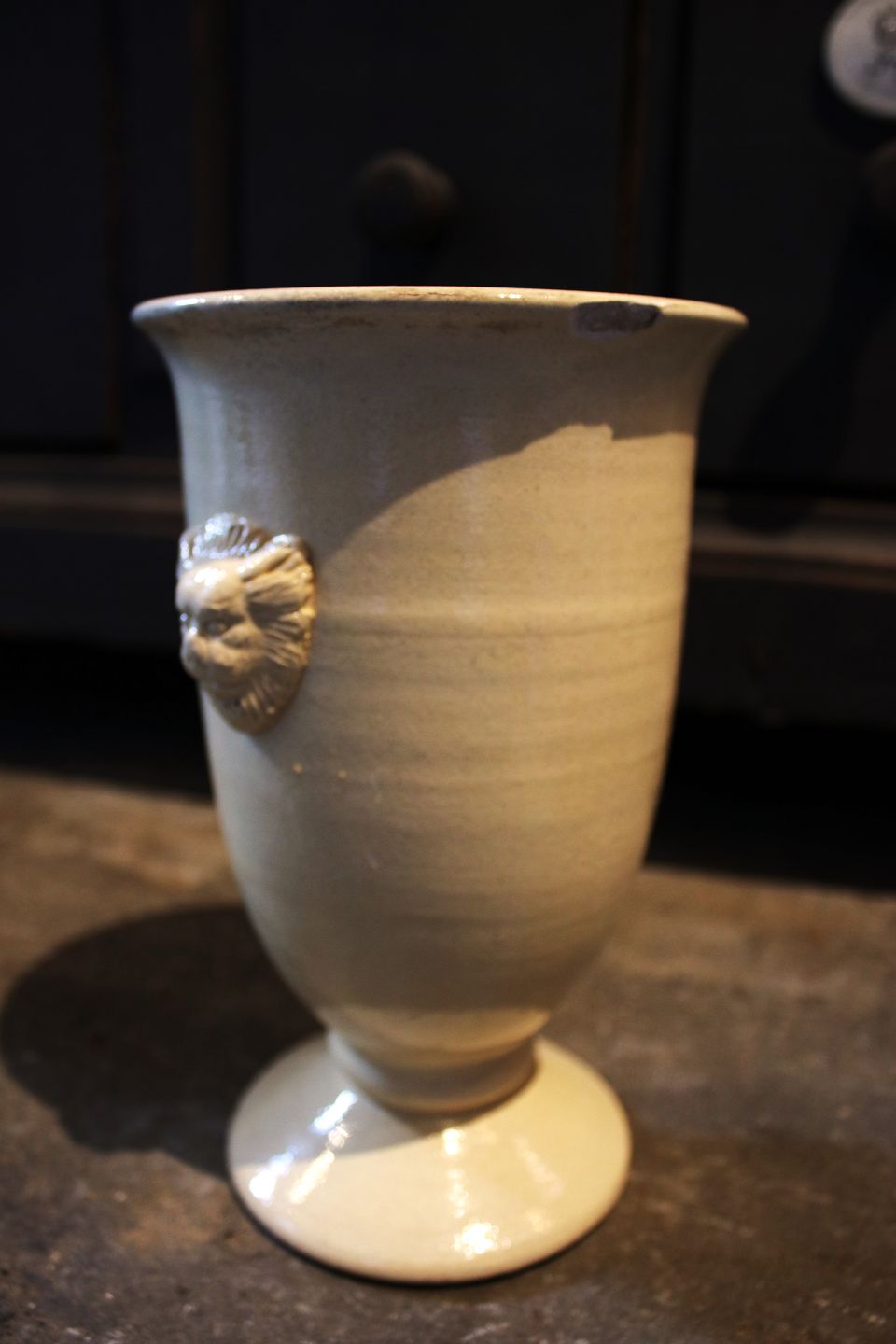 Gammel creme farvet glaseret keramikvase med løve hoved.