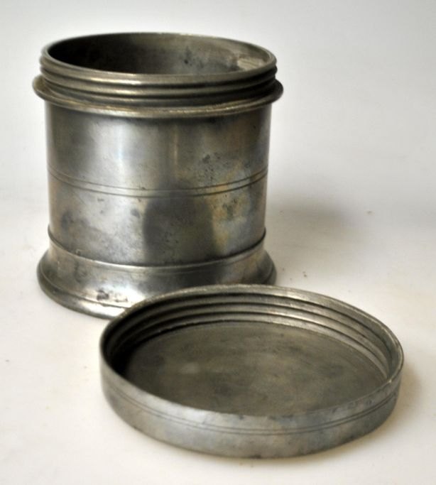 Tin tobaksdåse, med skruelåg, ca. 1780.