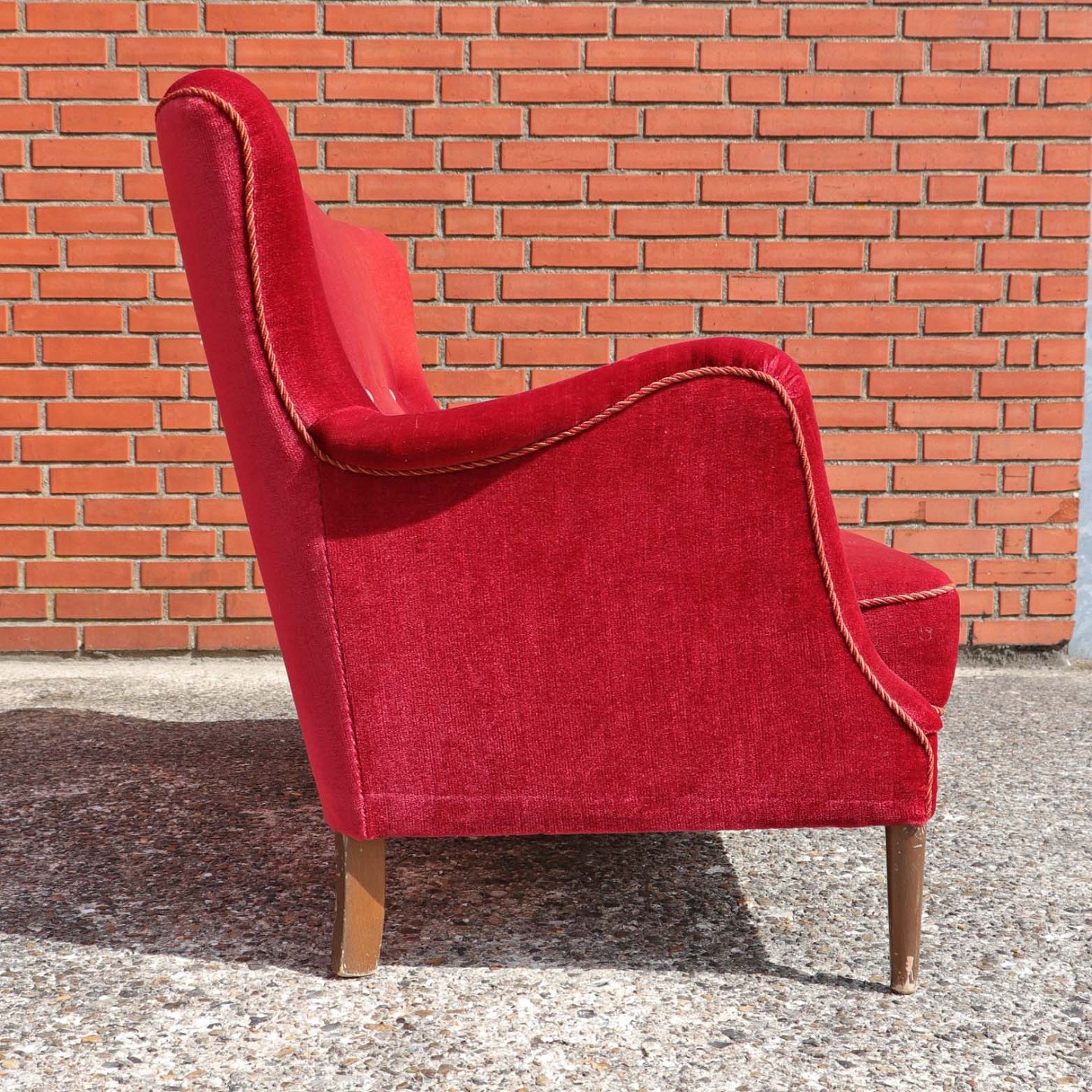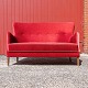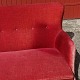 Ældre to personers sofa betrukket med slidstærkt rødt velour stof og ben i mørk lakeret træ