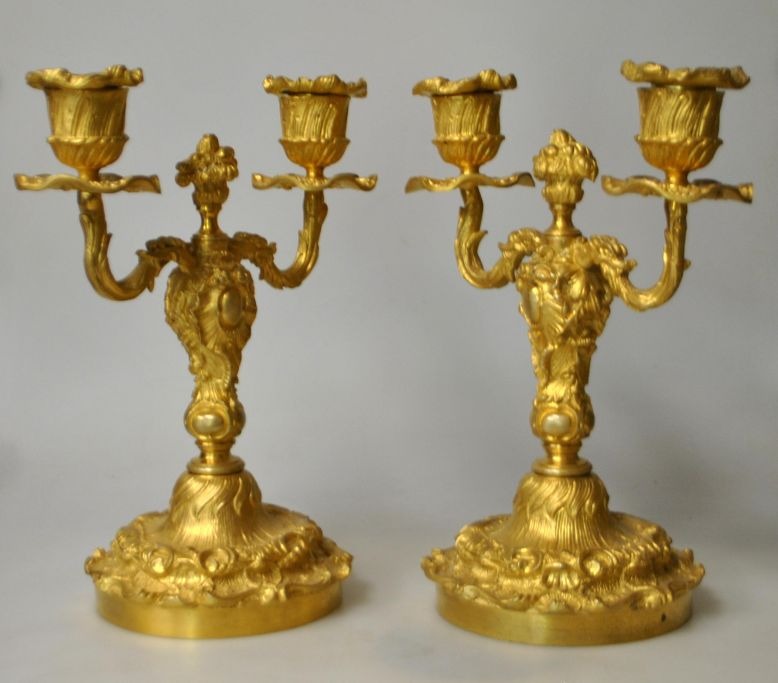 Par franske lue forgyldte bronze stager, 19. årh. Med to arme. Dekoration i form af bladværk. Højde.: 22 cm. B. 18,5 cm.
