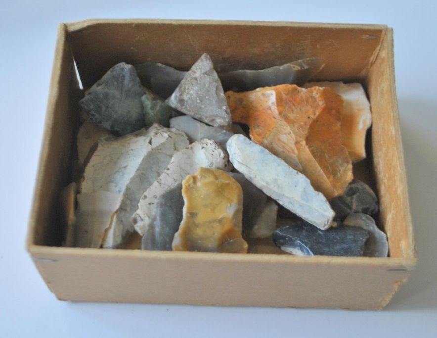 Box with cracks, arrowheads, etc. Stone Age, Denmark.