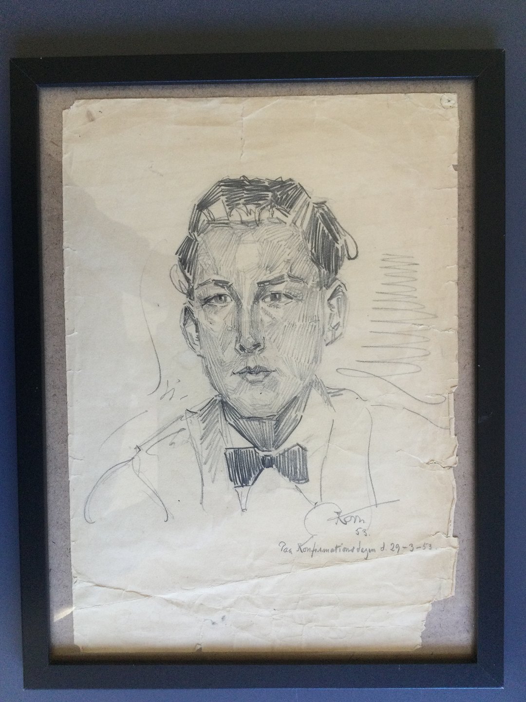 Tegning af H.J. Korn 1953 - Portræt af en dreng - Konfirmand.