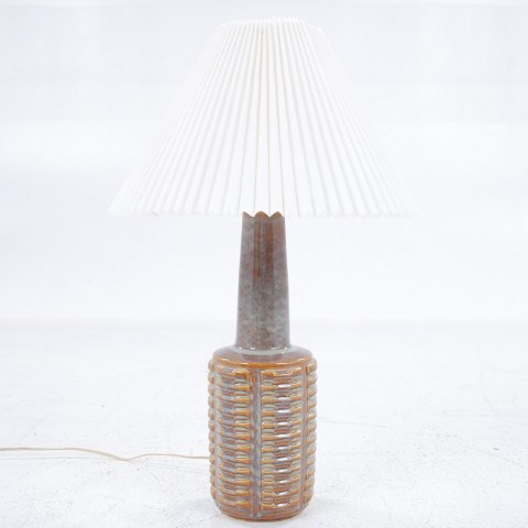Bordlampe i keramik m. rødbrun glasur og hvid plisseret skærm.