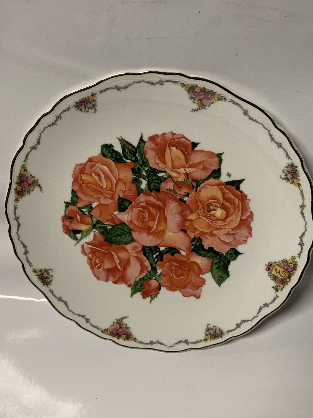 Smuk blomsterplatte med motiv af engelske roser "Elisabeth of Glamis". Flot farverigt motiv, der gør platten levende. Platten har desuden guldkant . Motivet er malet af Sara Anne Schofield. f