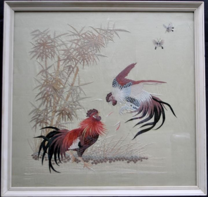 Kinesisk silkebroderi, 20. årh. To kæmpende haner.