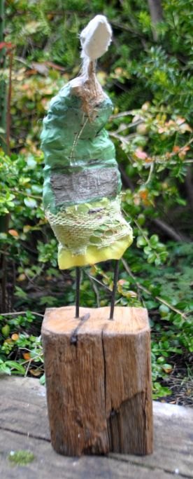 Vittanen, Paula (1956 - ) Finland, Danmark: Grønt fuglemenneske. Skulptur i mixed media på træ sokkel. Signeret: Paula VII 2005 Samsø. H: 37 cm.
