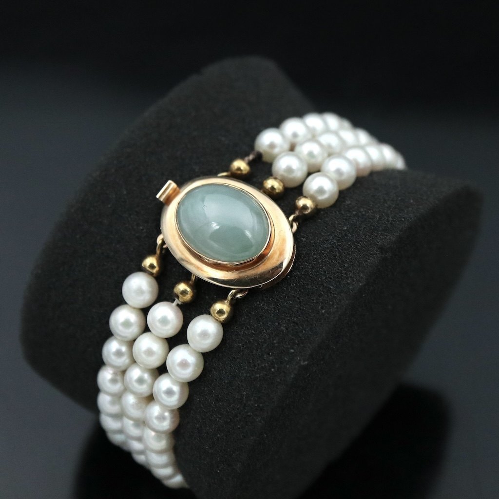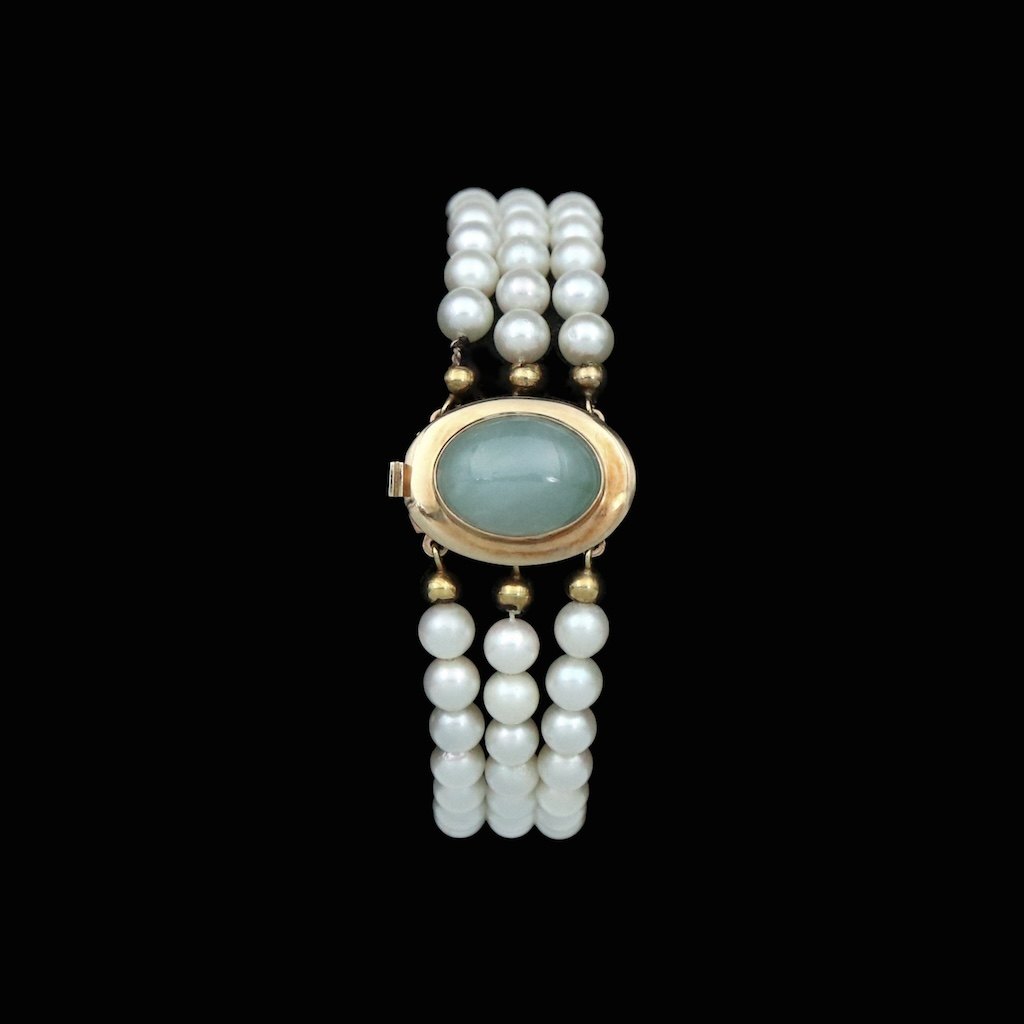 Paul Asger Larsen. Tre-radet perlearmbånd med lås i 14k guld med Jade.