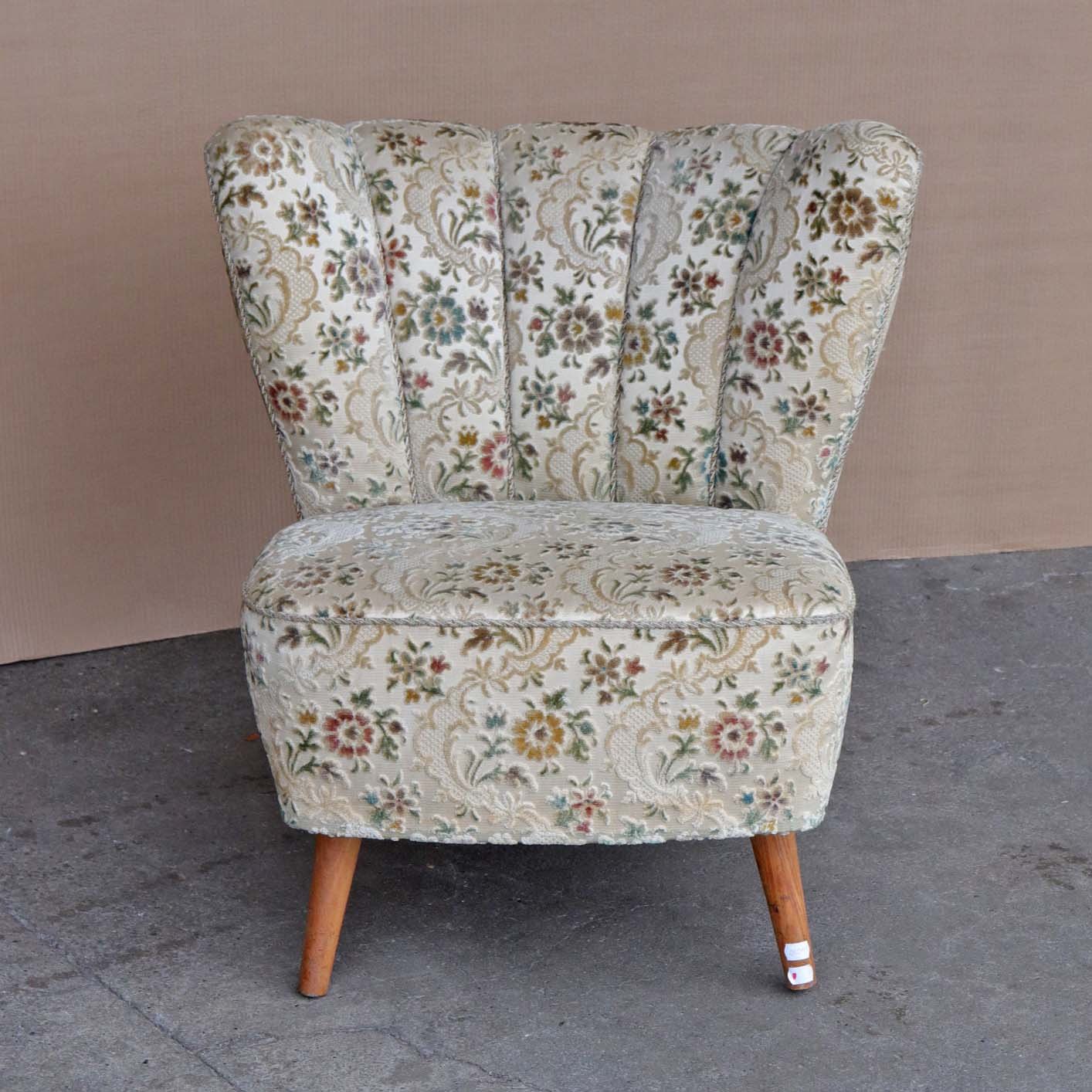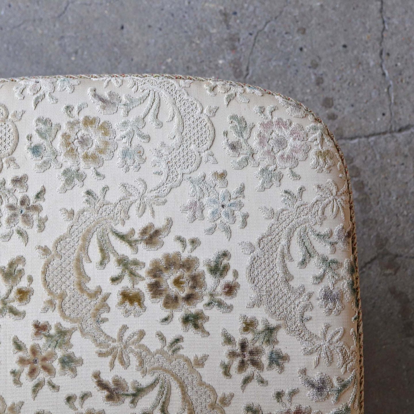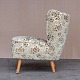 Ældre lænestol med ben i lakeret lys mahonie. Stolen er betrukket med lyst struktureret stof med blomstermønster og har sæde med springfjeder