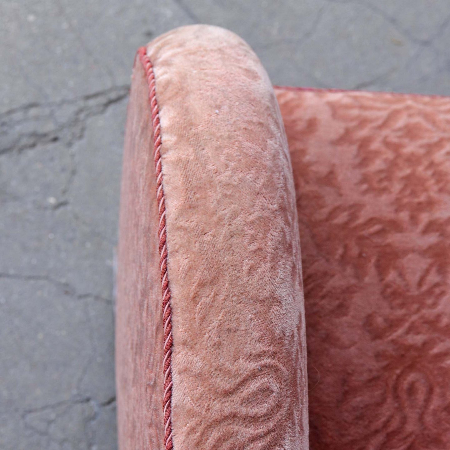 Ældre lænestol med stel i mørk lakeret træ. Stolen er betrukket med rosafarvet struktureret stof og har sæde med springfjeder
