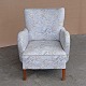 Ældre lænestol med stel i lakeret træ. Stolen er betrukket med lyst mønstret stof og har sæde med springfjeder