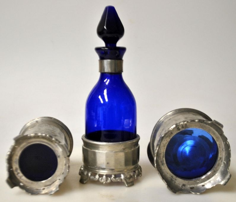 Andersen, Just (1884 - 1943) Danmark: Samling af peberbøsse, sennepsskål og eddikeflaske i blåt glas og tin, no. 346, 1918 - 1929. Peberbøsse H: 8 cm. Sennepsskål H: 6 cm. Dia 6 cm. Eddikeflaske H: 15 cm. Stemplet: Just.