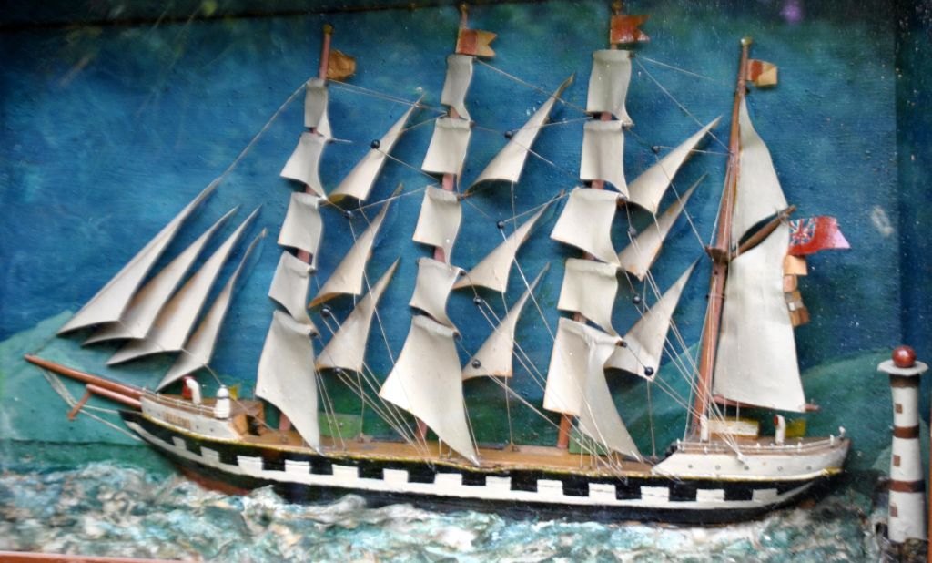 Halv skib, 19. årh. England. Fire mastet fludrigger, "Ellen", der fører engelsk handelsflag. Til højre: fyrtårn. 32 x 51 cm. D.: 9,5 cm. I mørkbemalet trææske.