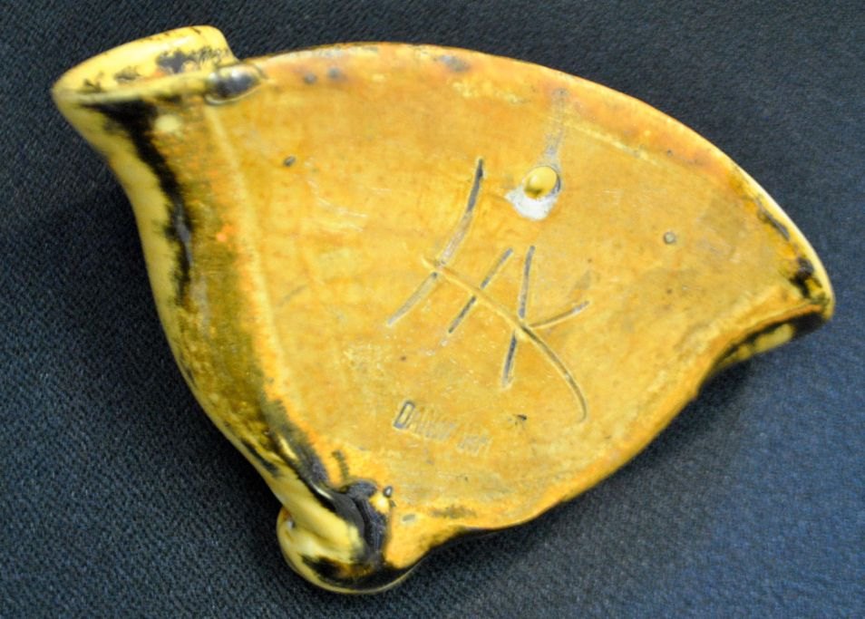 Herman A. Kähler vægvase urangul glasur, o. 1930. Næstved, Danmark. Højde.: 12 cm. B.: 17,5 cm. Signeret.: HAK og DANMARK.