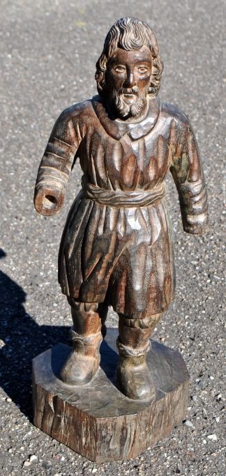 Udskåret træfigur af Sankt Morten (Martin),18./19. årh. Filipinerne. Hårdt træ. Sankt Morten i tøj og store støvler. H.: 51 cm.
