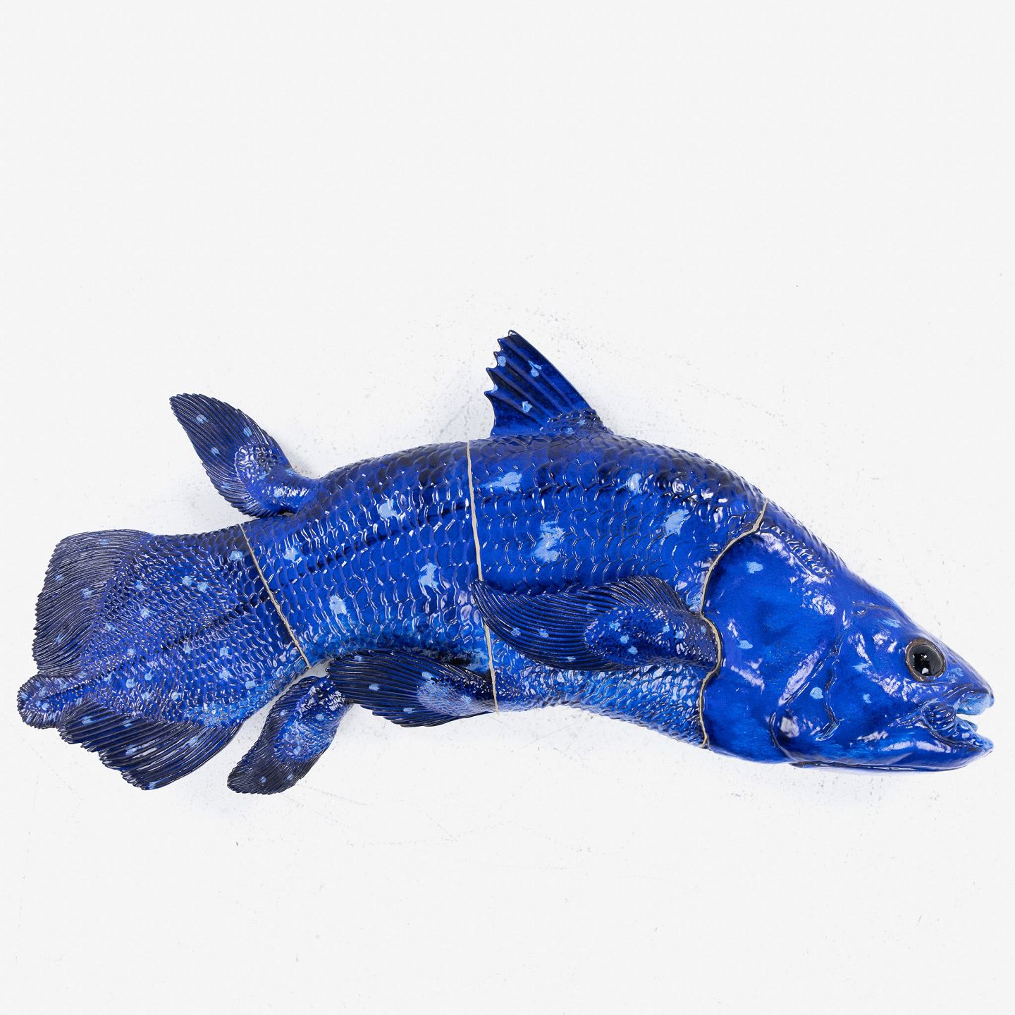 Væghængt reliefskulptur ""Blå Fisk"" i blåglaseret fajance efter Coelacanther fisk.