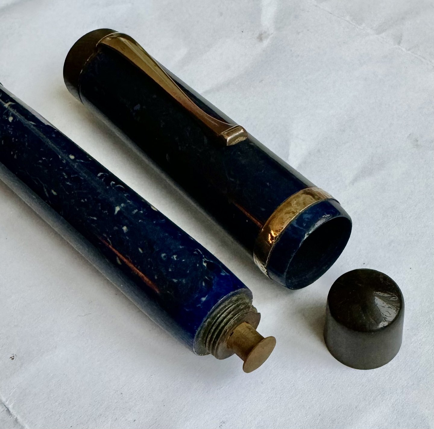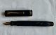Blå Parker Duofold Lapis Lasuli fyldepen. Fungerer ikke. Der skal indsættes ny gummisæk før end fyldepennen igen kan påfyldes blæk og bruges påny. Har to revner på hættens kant. For enden ses en 14 karat guldspids, men ikke originalt Parker produkt ligesom clip’en ej heller er original til denne fyldepen. 12,4 cm