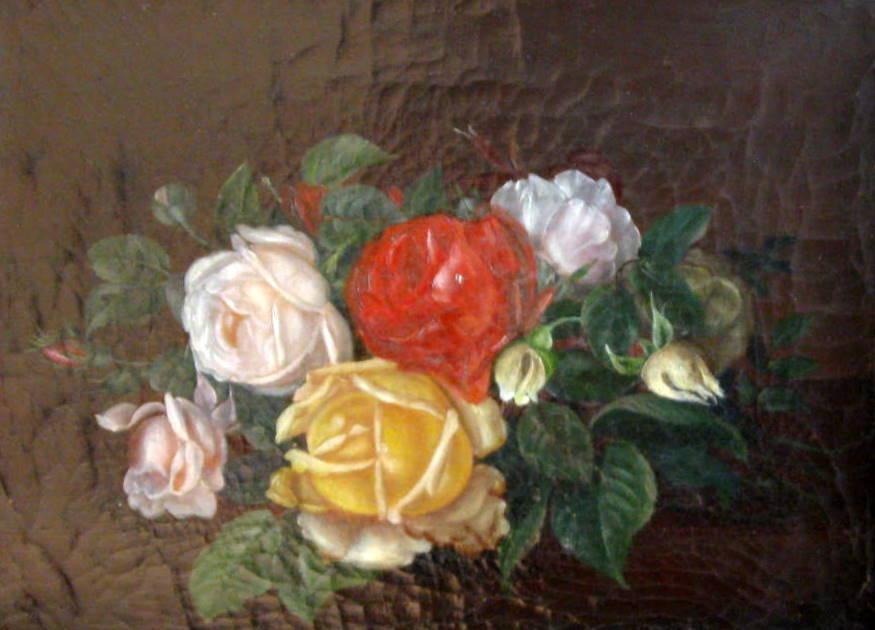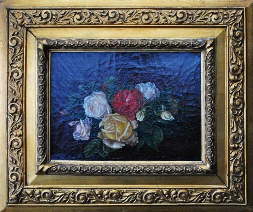 Dansk kunstner (19. årh.): Opstilling med roser. Olie på lærred. Signeret MG 1878. 23 x 30 cm. Antagelig malet af Mary Grøn (set på bagsiden). I dekoreret guldramme.