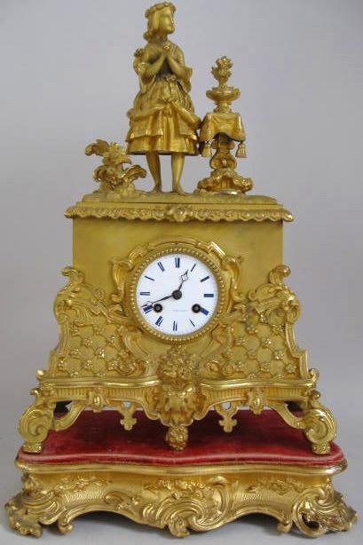 Fransk kaminur i lueforgyldt bronze, Frankrig, o. 1819, dekoreret kasse med rococmønstre og topfigur i form af bendende ung kvinde. H.: 46 cm. B.: 31 cm. Med urværk, 8- døgn, snorophængt, med emaljeret skive med romertal i blåt og signaturen.: Schaefer. På italiensk forgyldt træstand i rococo. L.: 35 cm. Signeret.: Rosiane, med nummeret 1448.