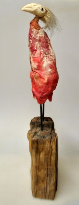 Vittanen, Paula (1956 - ) Finland, Danmark: Rødt fuglemenneske, 2005. Skulptur i mixed media på træ sokkel. Signeret: Paula VII 2005 Samsø. H: 34 cm.