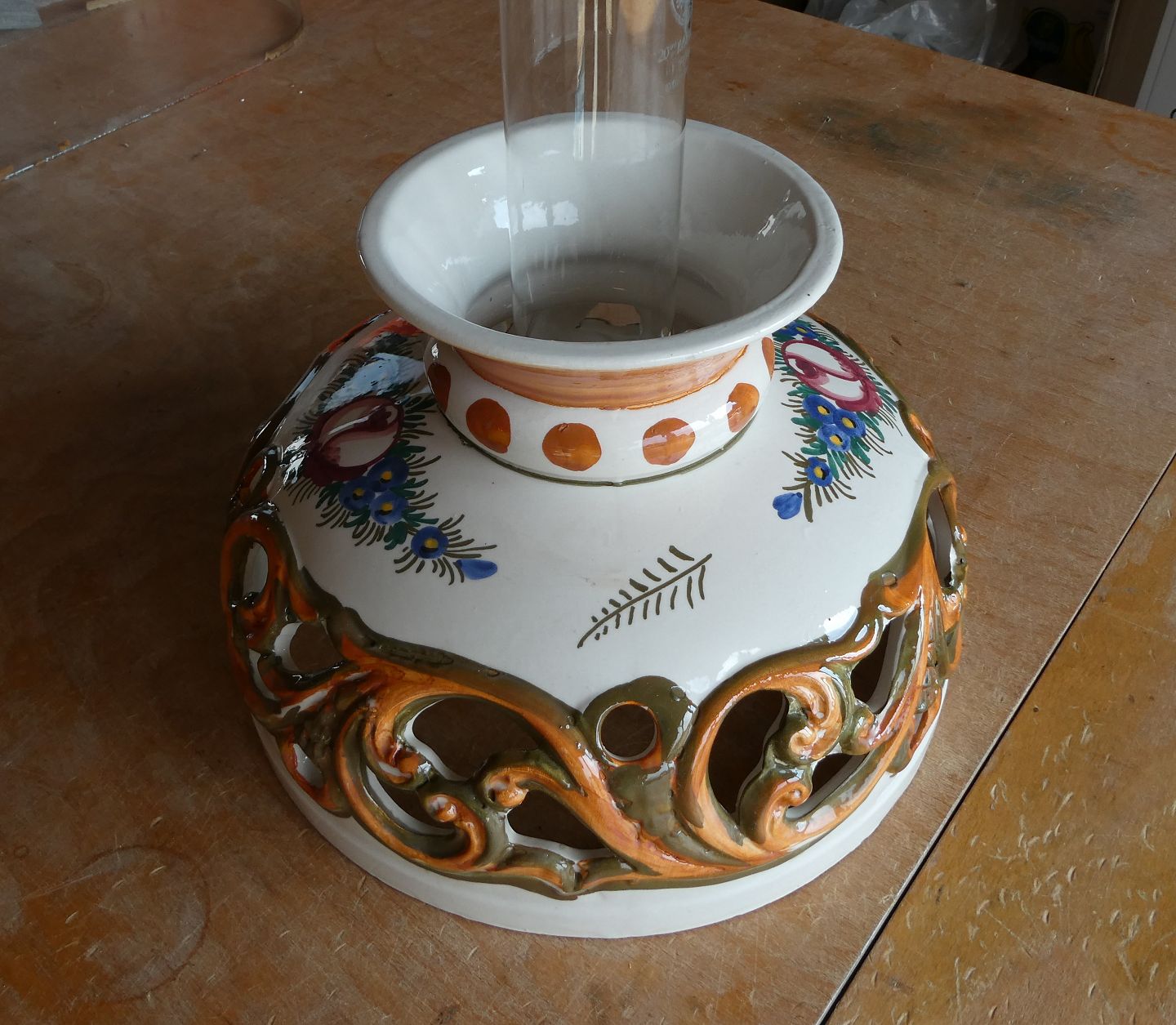 Flot dekoreret skærm i stentøj samt glasrør til petroleumslampen.