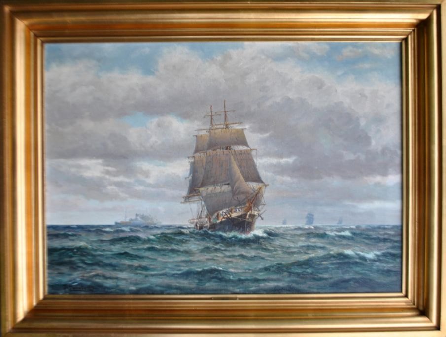 Landt, Frants (1885 - 1975) Danmark: Marine med sejlskib og andre skibe. Olie på lærred. Signeret 1933. 60 x 86 cm.