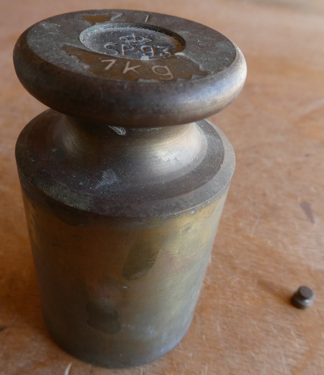Vægtlodder i messing og i kasse, alle stemplet. I alt 13 vægtlodder fra 1kg ned til 1g.
