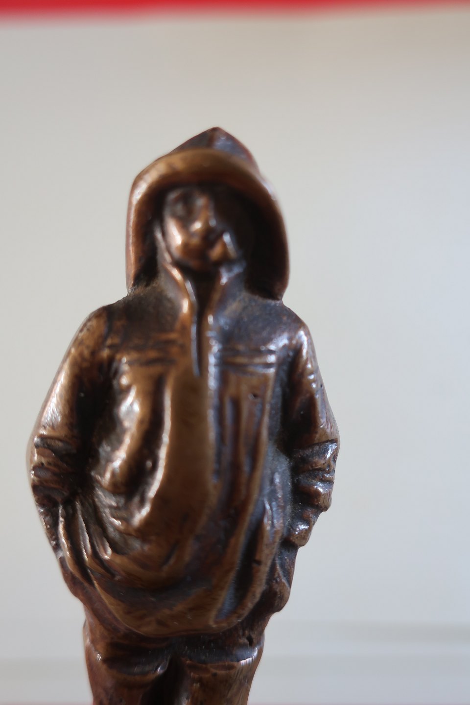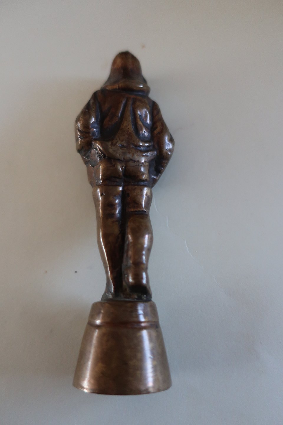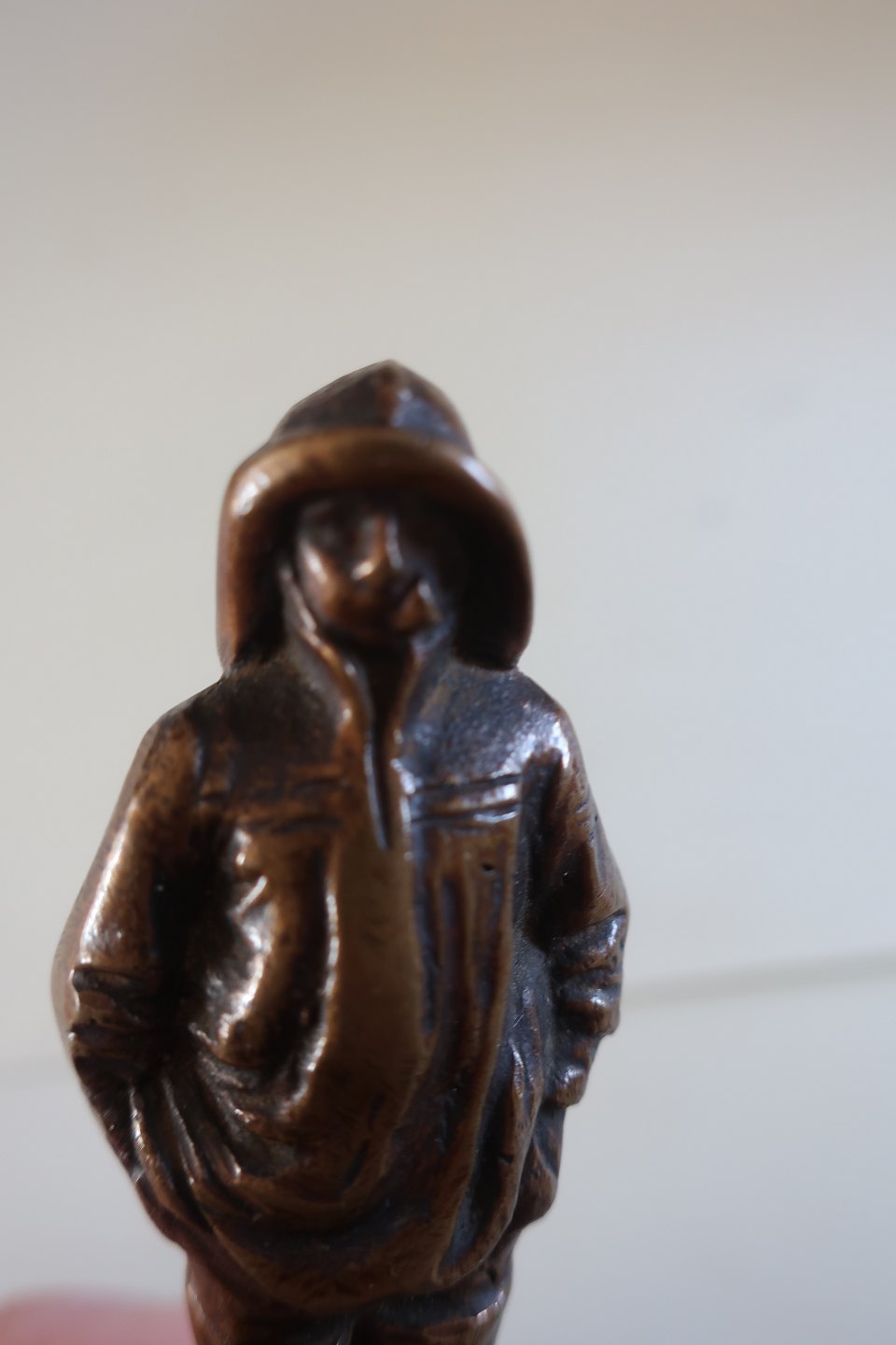 Antik figur, måske fisker, med sydvest i messing